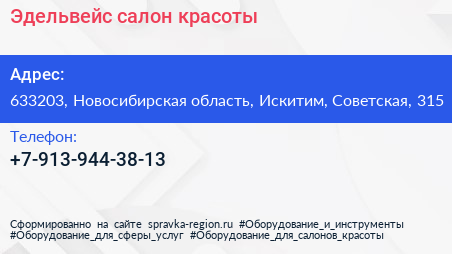 Эдельвейс, салон красоты по адресу 633203, Новосибирская область, Искитим, Советская, 315 в дальнейшем Организация, размещена в следующих категориях: