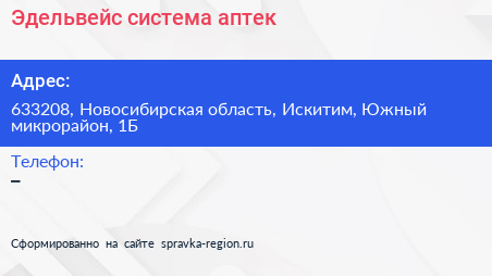 Эдельвейс, система аптек по адресу 633208, Новосибирская область, Искитим, Южный микрорайон, 1Б в дальнейшем Организация, размещена в следующих категориях: