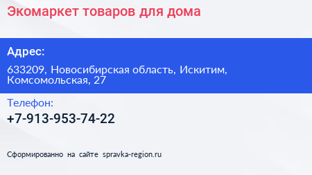Экомаркет товаров для дома по адресу 633209, Новосибирская область, Искитим, Комсомольская, 27 в дальнейшем Организация, размещена в следующих категориях: