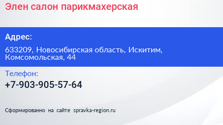 Элен, салон-парикмахерская по адресу 633209, Новосибирская область, Искитим, Комсомольская, 44 в дальнейшем Организация, размещена в следующих категориях: