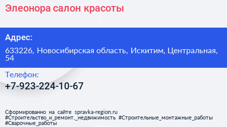 Элеонора, салон красоты по адресу 633226, Новосибирская область, Искитим, Центральная, 54 в дальнейшем Организация, размещена в следующих категориях: