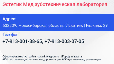 Эстетик-Мед, зуботехническая лаборатория по адресу 633209, Новосибирская область, Искитим, Пушкина, 39 в дальнейшем Организация, размещена в следующих категориях: