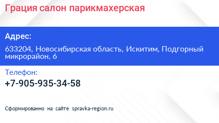 Грация, салон-парикмахерская по адресу 633204, Новосибирская область, Искитим, Подгорный микрорайон, 6 в дальнейшем Организация, размещена в следующих категориях: