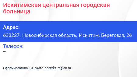 Искитимская центральная городская больница по адресу 633227, Новосибирская область, Искитим, Береговая, 26 в дальнейшем Организация, размещена в следующих категориях: