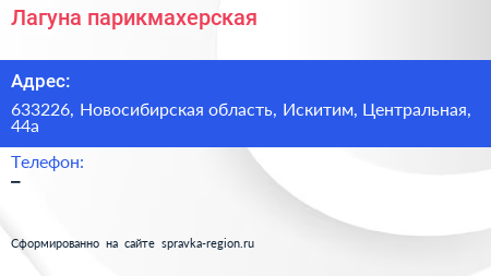 Лагуна, парикмахерская по адресу 633226, Новосибирская область, Искитим, Центральная, 44а в дальнейшем Организация, размещена в следующих категориях: