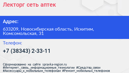 Лекторг, сеть аптек по адресу 633209, Новосибирская область, Искитим, Комсомольская, 31 в дальнейшем Организация, размещена в следующих категориях: