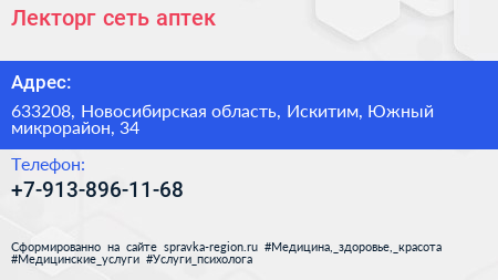 Лекторг, сеть аптек по адресу 633208, Новосибирская область, Искитим, Южный микрорайон, 34 в дальнейшем Организация, размещена в следующих категориях:
