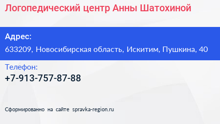 Логопедический центр Анны Шатохиной по адресу 633209, Новосибирская область, Искитим, Пушкина, 40 в дальнейшем Организация, размещена в следующих категориях: