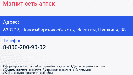 Магнит, сеть аптек по адресу 633209, Новосибирская область, Искитим, Пушкина, 38 в дальнейшем Организация, размещена в следующих категориях: