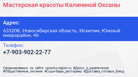 Мастерская красоты Калининой Оксаны по адресу 633208, Новосибирская область, Искитим, Южный микрорайон, 46 в дальнейшем Организация, размещена в следующих категориях: