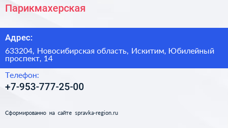 Парикмахерская по адресу 633204, Новосибирская область, Искитим, Юбилейный проспект, 14 в дальнейшем Организация, размещена в следующих категориях: