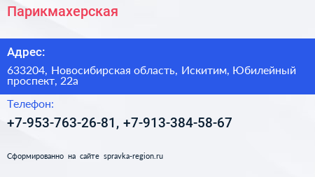 Парикмахерская по адресу 633204, Новосибирская область, Искитим, Юбилейный проспект, 22а в дальнейшем Организация, размещена в следующих категориях: