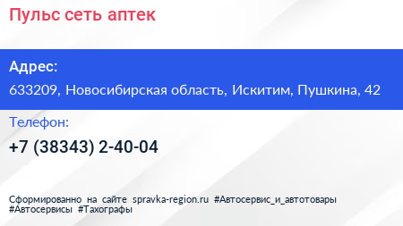 Пульс, сеть аптек по адресу 633209, Новосибирская область, Искитим, Пушкина, 42 в дальнейшем Организация, размещена в следующих категориях: