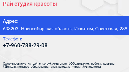 Рай, студия красоты по адресу 633203, Новосибирская область, Искитим, Советская, 289 в дальнейшем Организация, размещена в следующих категориях: