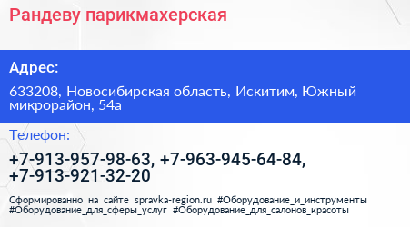 Рандеву, парикмахерская по адресу 633208, Новосибирская область, Искитим, Южный микрорайон, 54а в дальнейшем Организация, размещена в следующих категориях: