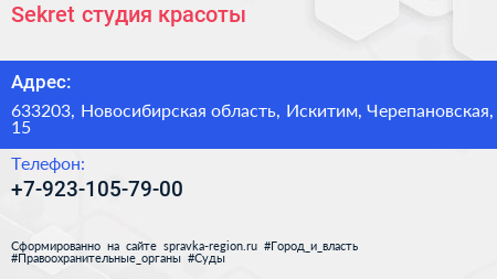 Sekret, студия красоты по адресу 633203, Новосибирская область, Искитим, Черепановская, 15 в дальнейшем Организация, размещена в следующих категориях:
