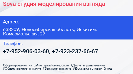 Sova, студия моделирования взгляда по адресу 633209, Новосибирская область, Искитим, Комсомольская, 27 в дальнейшем Организация, размещена в следующих категориях: