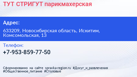 ТУТ СТРИГУТ, парикмахерская по адресу 633209, Новосибирская область, Искитим, Комсомольская, 13 в дальнейшем Организация, размещена в следующих категориях: