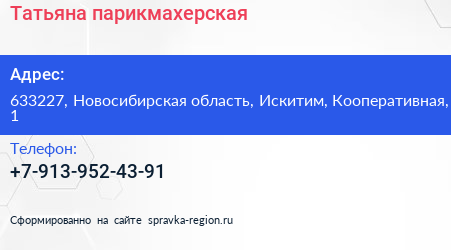Татьяна, парикмахерская по адресу 633227, Новосибирская область, Искитим, Кооперативная, 1 в дальнейшем Организация, размещена в следующих категориях: