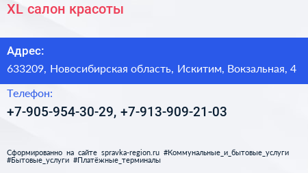 XL, салон красоты по адресу 633209, Новосибирская область, Искитим, Вокзальная, 4 в дальнейшем Организация, размещена в следующих категориях: