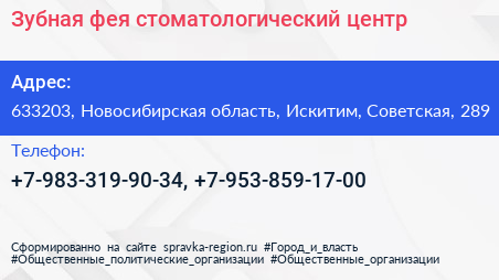 Зубная фея, стоматологический центр по адресу 633203, Новосибирская область, Искитим, Советская, 289 в дальнейшем Организация, размещена в следующих категориях: