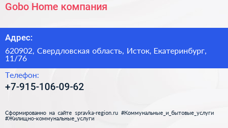 Gobo-Home, компания по адресу 620902, Свердловская область, Исток, Екатеринбург, 11/76 в дальнейшем Организация, размещена в следующих категориях: