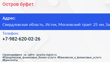 Остров, буфет по адресу Свердловская область, Исток, Московский тракт 25 км, 5а в дальнейшем Организация, размещена в следующих категориях: