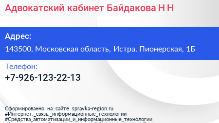 Адвокатский кабинет Байдакова Н.Н. по адресу 143500, Московская область, Истра, Пионерская, 1Б в дальнейшем Организация, размещена в следующих категориях: