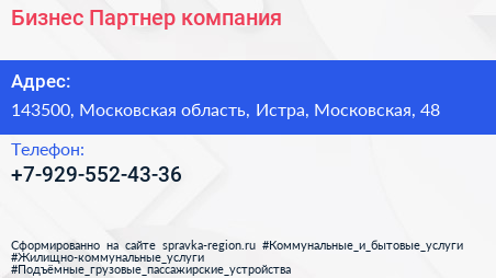 Бизнес-Партнер, компания по адресу 143500, Московская область, Истра, Московская, 48 в дальнейшем Организация, размещена в следующих категориях: