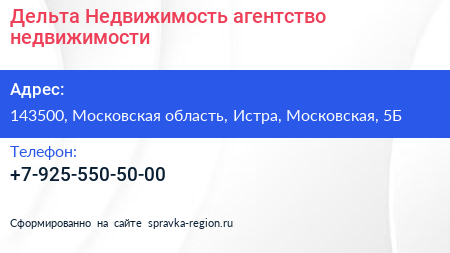 Дельта-Недвижимость, агентство недвижимости по адресу 143500, Московская область, Истра, Московская, 5Б в дальнейшем Организация, размещена в следующих категориях: