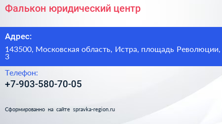 Фалькон, юридический центр по адресу 143500, Московская область, Истра, площадь Революции, 3 в дальнейшем Организация, размещена в следующих категориях: