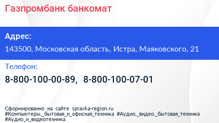 Газпромбанк, банкомат по адресу 143500, Московская область, Истра, Маяковского, 21 в дальнейшем Организация, размещена в следующих категориях: