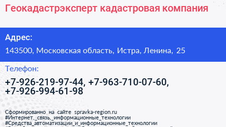 Геокадастрэксперт, кадастровая компания по адресу 143500, Московская область, Истра, Ленина, 25 в дальнейшем Организация, размещена в следующих категориях: