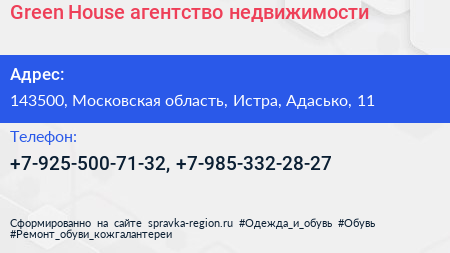 Green House, агентство недвижимости по адресу 143500, Московская область, Истра, Адасько, 11 в дальнейшем Организация, размещена в следующих категориях: