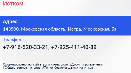 Истком по адресу 143500, Московская область, Истра, Московская, 5а в дальнейшем Организация, размещена в следующих категориях: