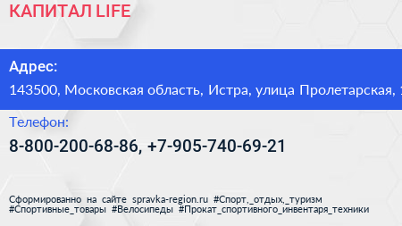КАПИТАЛ LIFE по адресу 143500, Московская область, Истра, улица Пролетарская, 1 в дальнейшем Организация, размещена в следующих категориях: