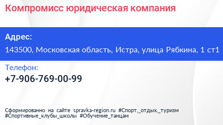 Компромисс, юридическая компания по адресу 143500, Московская область, Истра, улица Рябкина, 1 ст1 в дальнейшем Организация, размещена в следующих категориях: