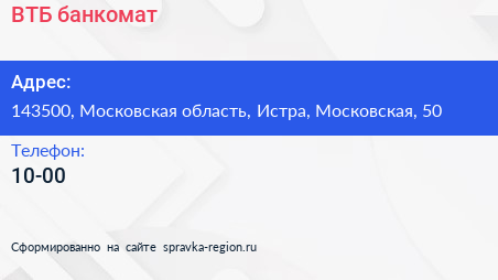 ВТБ, банкомат по адресу 143500, Московская область, Истра, Московская, 50 в дальнейшем Организация, размещена в следующих категориях:
