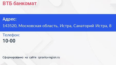 ВТБ, банкомат по адресу 143520, Московская область, Истра, Санаторий Истра, 8 в дальнейшем Организация, размещена в следующих категориях: