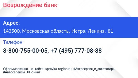 Возрождение, банк по адресу 143500, Московская область, Истра, Ленина, 81 в дальнейшем Организация, размещена в следующих категориях: