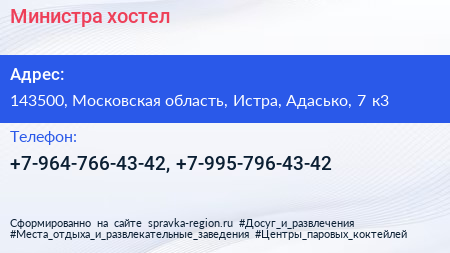 Министра, хостел по адресу 143500, Московская область, Истра, Адасько, 7 к3 в дальнейшем Организация, размещена в следующих категориях: