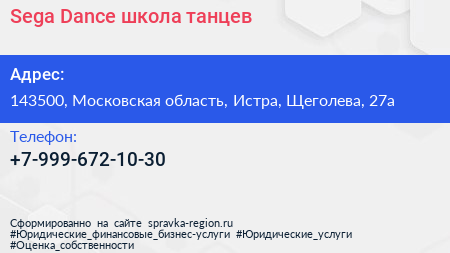 Sega Dance, школа танцев по адресу 143500, Московская область, Истра, Щеголева, 27а в дальнейшем Организация, размещена в следующих категориях:
