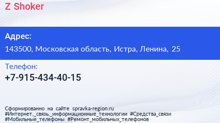 Z-Shoker по адресу 143500, Московская область, Истра, Ленина, 25 в дальнейшем Организация, размещена в следующих категориях: