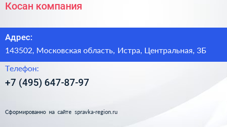 Косан, компания по адресу 143502, Московская область, Истра, Центральная, 3Б в дальнейшем Организация, размещена в следующих категориях: