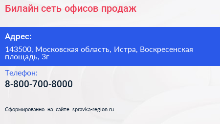 Билайн, сеть офисов продаж по адресу 143500, Московская область, Истра, Воскресенская площадь, 3г в дальнейшем Организация, размещена в следующих категориях: