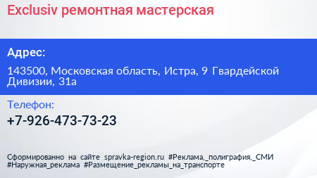 Exclusiv, ремонтная мастерская по адресу 143500, Московская область, Истра, 9 Гвардейской Дивизии, 31а в дальнейшем Организация, размещена в следующих категориях: