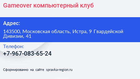 Gameover, компьютерный клуб по адресу 143500, Московская область, Истра, 9 Гвардейской Дивизии, 41 в дальнейшем Организация, размещена в следующих категориях: