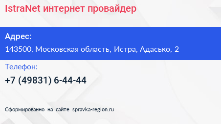 IstraNet, интернет-провайдер по адресу 143500, Московская область, Истра, Адасько, 2 в дальнейшем Организация, размещена в следующих категориях: