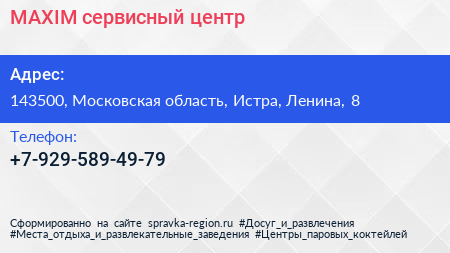 MAXIM, сервисный центр по адресу 143500, Московская область, Истра, Ленина, 8 в дальнейшем Организация, размещена в следующих категориях: