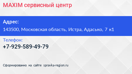 MAXIM, сервисный центр по адресу 143500, Московская область, Истра, Адасько, 7 к1 в дальнейшем Организация, размещена в следующих категориях: